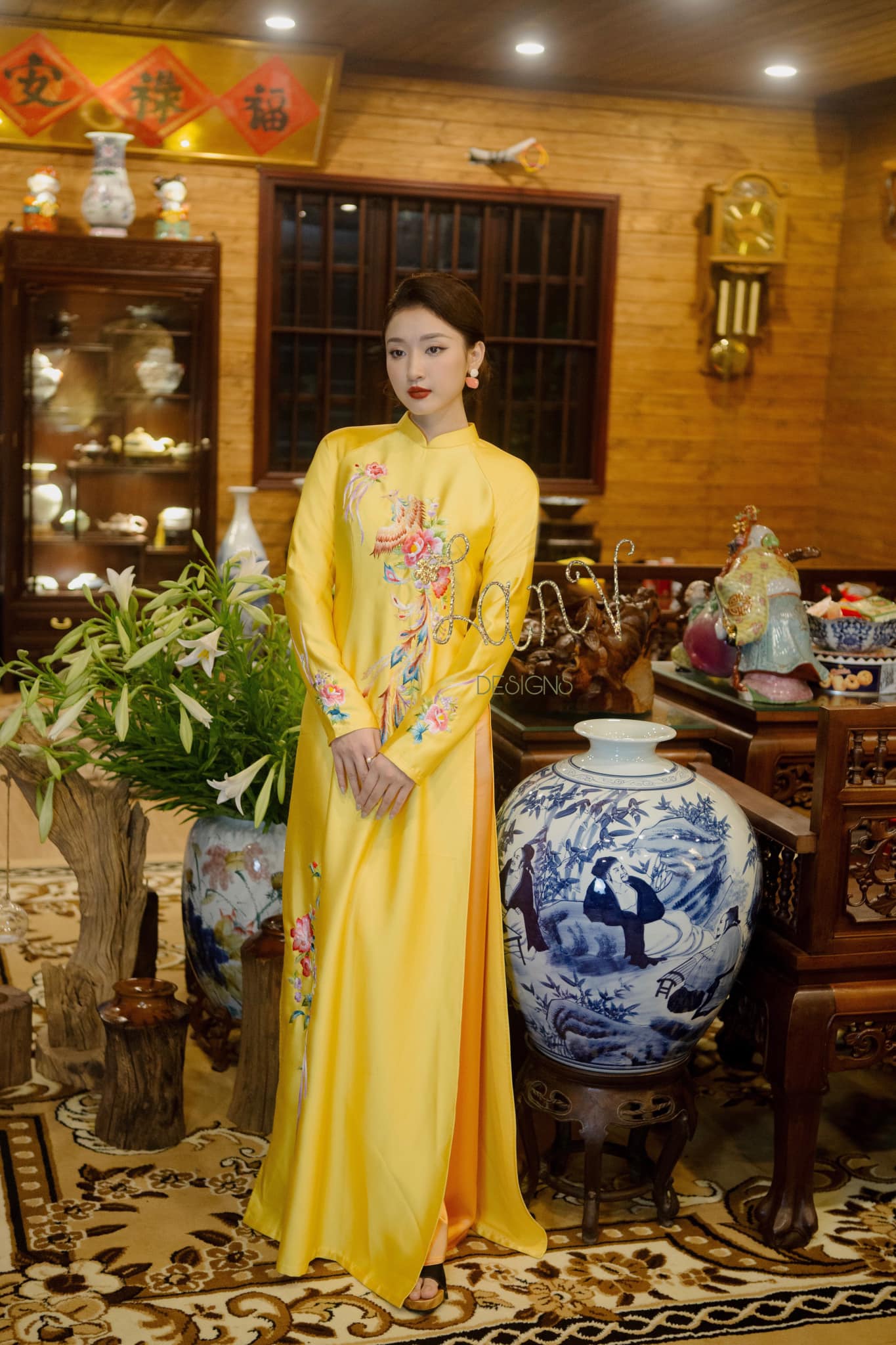 Hoa văn: Những họa tiết màu sắc sặc sỡ và rực rỡ trên áo dài không chỉ làm cho bức tranh trở nên sinh động mà còn tạo điểm nhấn thu hút ánh nhìn. Việc kết hợp vải bóng hoặc sử dụng ren nhẹ nhàng giúp tăng thêm vẻ sang trọng và quý phái cho người mặc. Hơn nữa, áo dài với những họa tiết càng lớn, cầu kỳ sẽ làm cho hình ảnh gầy guộc trở nên quyến rũ hơn, thay vì chỉ là sự mảnh mai khó chịu.