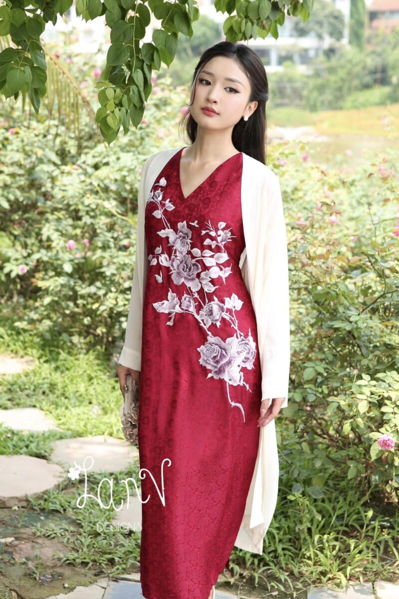 Váy lụa tơ tằm màu đỏ đô thêu tay mẫu hoa hồng