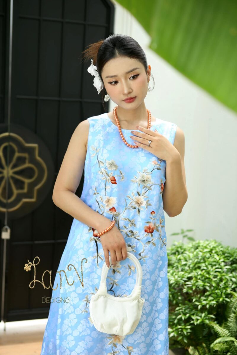 Váy lụa tơ tằm màu lơ thêu tay mẫu hoa dây